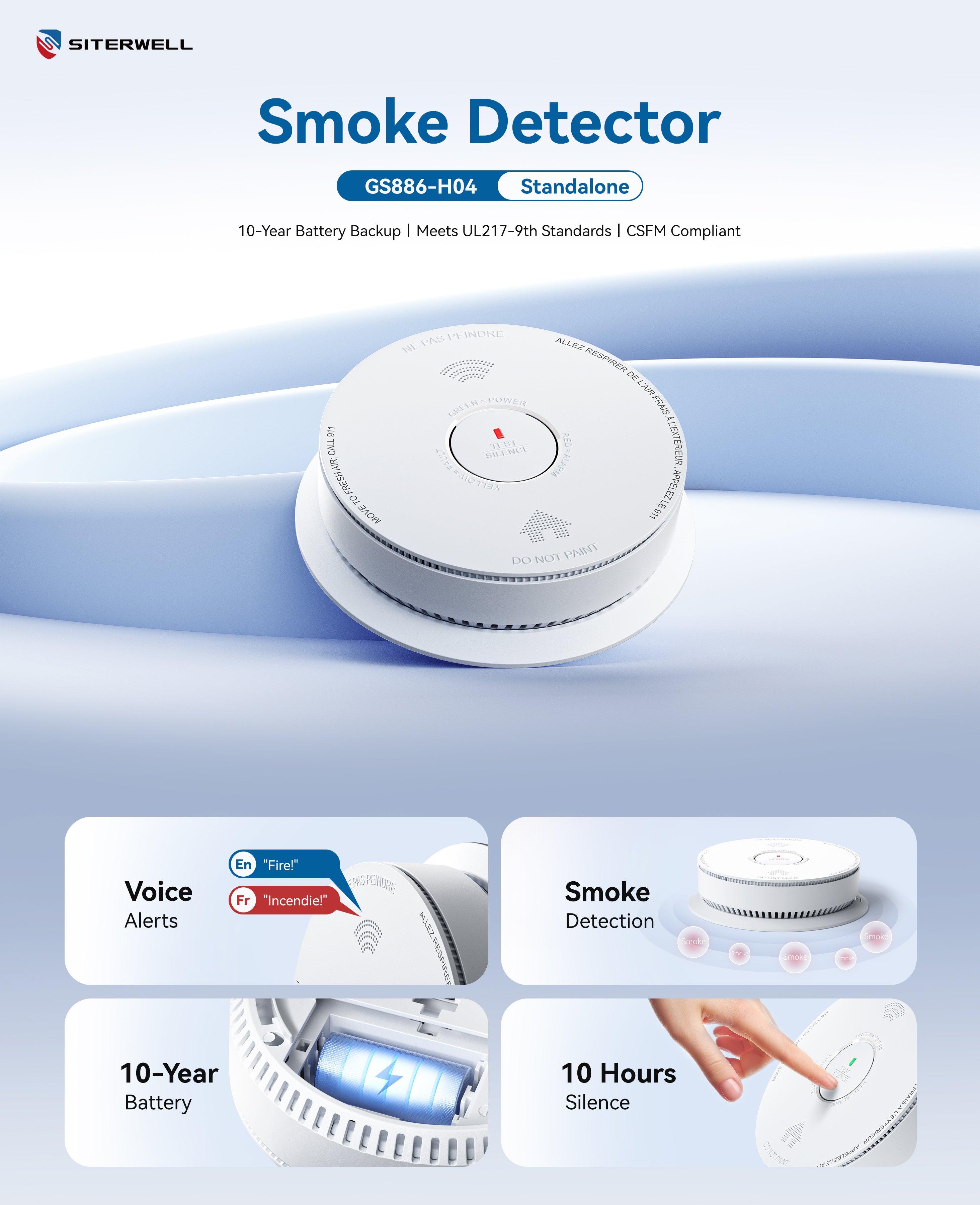 Siterwell GS886-H04 Standalone Smoke Detector with 10-Year Battery